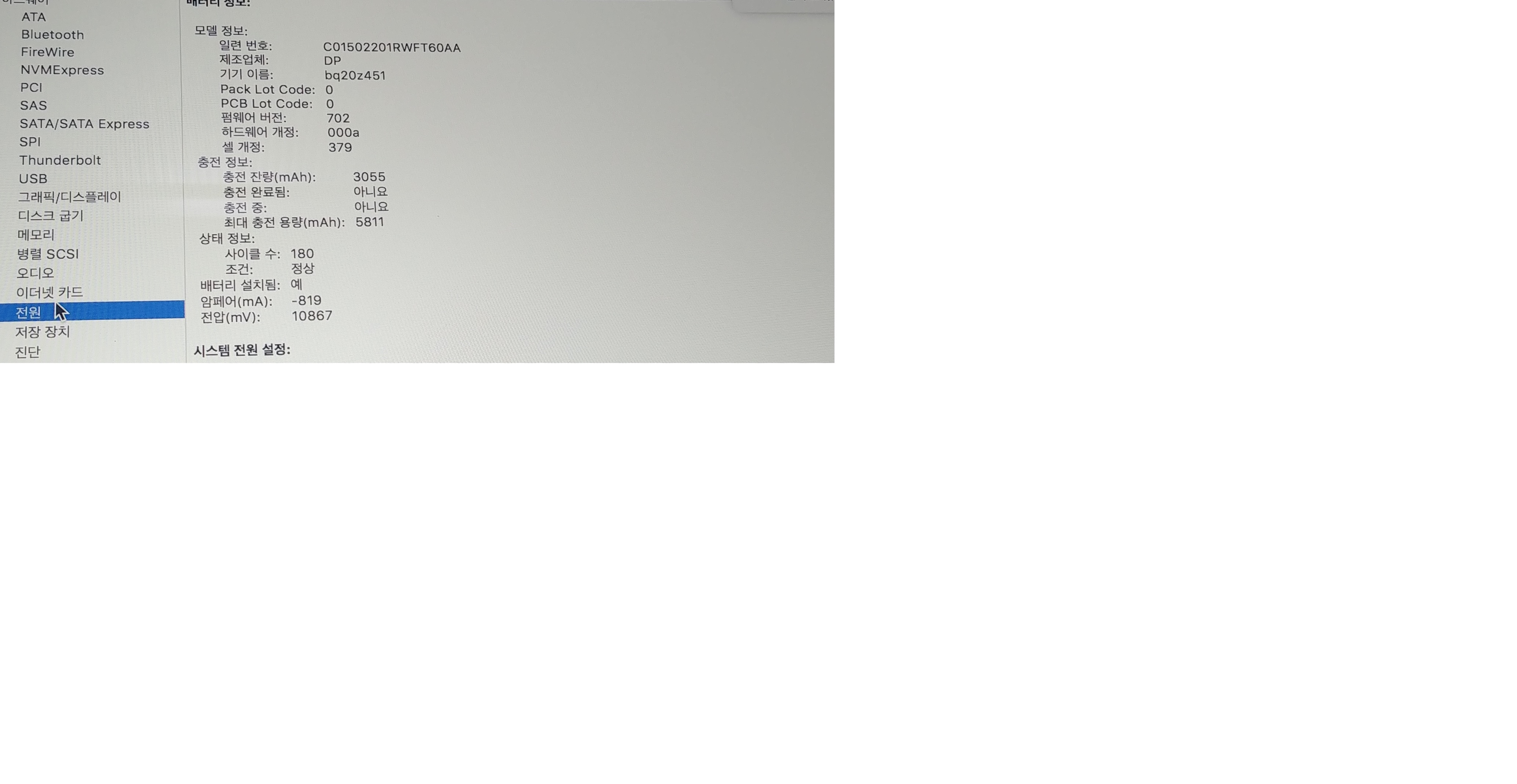 배터리 사이클 180  최대충전용량 5811